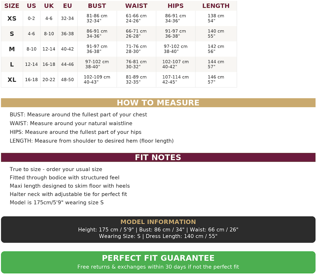 Falls to floor level. Approximately 140 cm from shoulder to hem on size S. Maxi length designed to skim the ground when wearing heels, perfect for formal events.