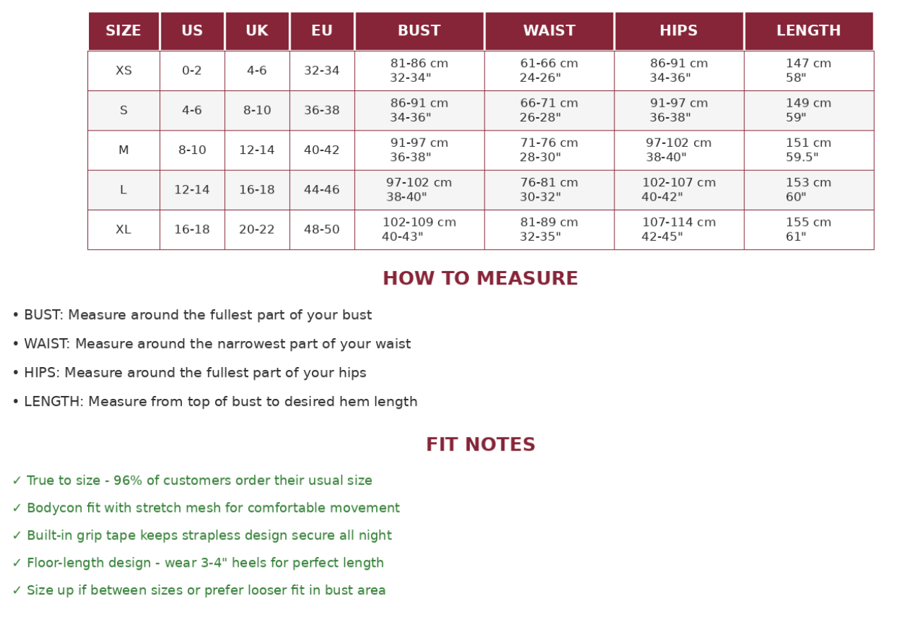 Fit: Bodycon silhouette with ruched mesh overlay for figure-hugging elegance. Strapless design with built-in grip tape.