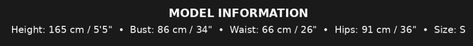 Model measurements: Bust 86 cm / 34", Waist 66 cm / 26", Hips 91 cm / 36"