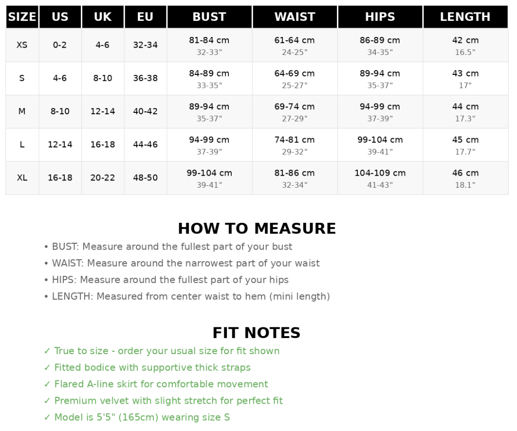 Mini length - hits mid-thigh (approximately 42-46 cm from waist depending on size). Perfect for: Holiday parties, Christmas events, New Year's celebrations, date nights.